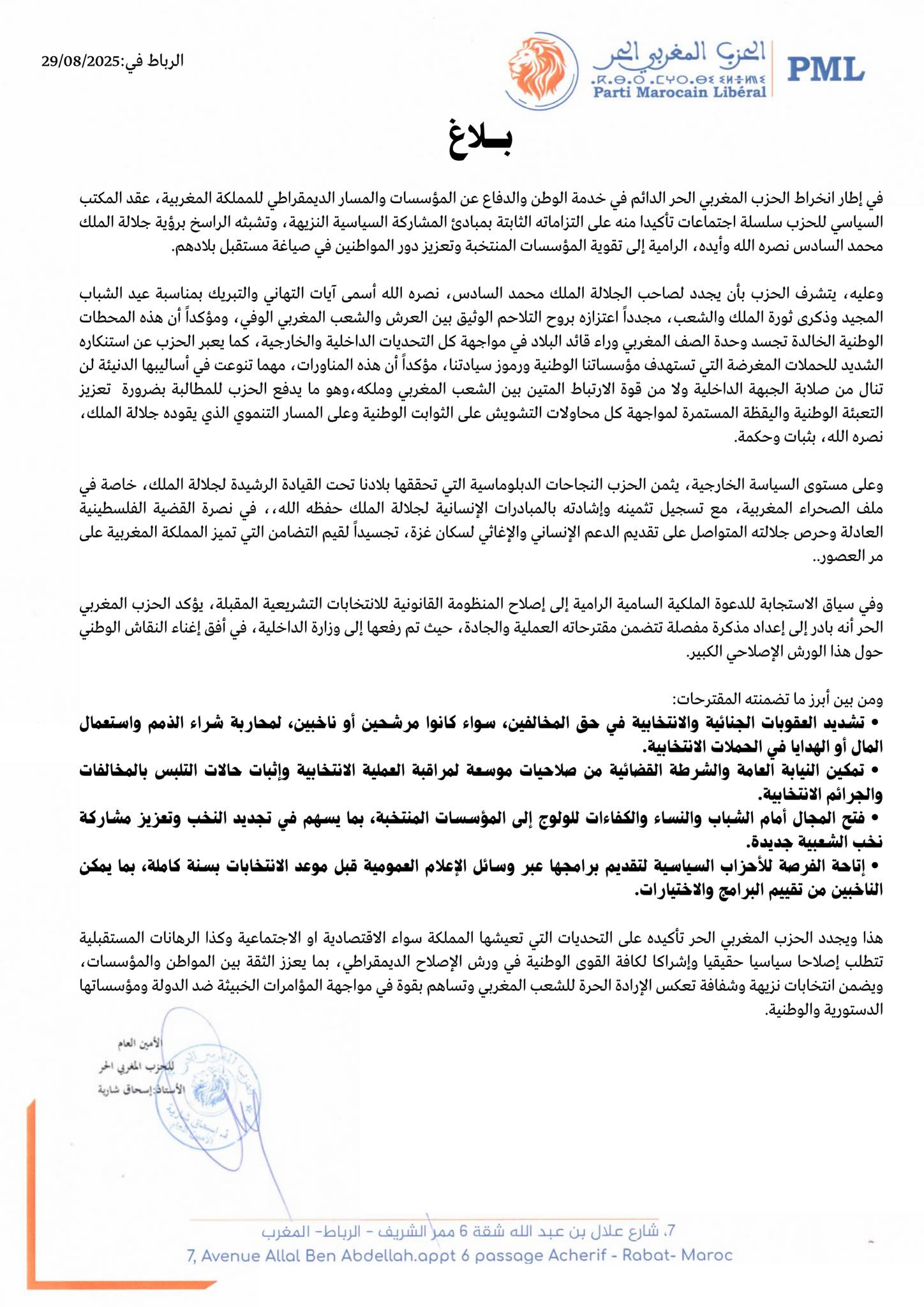 هذا ويجدد الحزب المغربي الحر تأكيده على التحديات التي تعيشها المملكة سواء الاقتصادية او الاجتماعية وكذا الرهانات المستقبلية تتطلب إصلاحا سياسيا حقيقيا وإشراكا لكافة القوى الوطنية في ورش الإصلاح الديمقراطي، بما يعزز الثقة بين المواطن والمؤسسات، ويضمن انتخابات نزيهة وشفافة تعكس الإرادة الحرة للشعب المغربي وتساهم بقوة في مواجهة المؤامرات الخبيثة ضد الدولة ومؤسساتها الدستورية والوطنية.